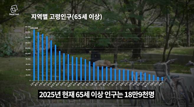 고양시는 현재 경기도에서 65세 이상 고령 인구가 가장 많은 지역으로, 2025년 기준 18만 9천 명이 넘습니다. 15년 후에는 세 명 중 한 명이 노인이 될 것으로 예상됩니다.