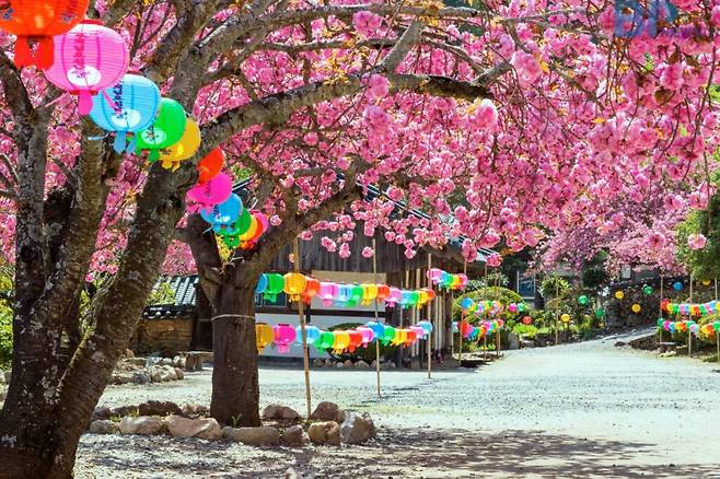 사찰로 향하는 길목마다 나무마다 가지마다 겹벚꽃이 피어 있어, 그 아래를 걷는 순간은 일상이 아닌 환상처럼 느껴진다.