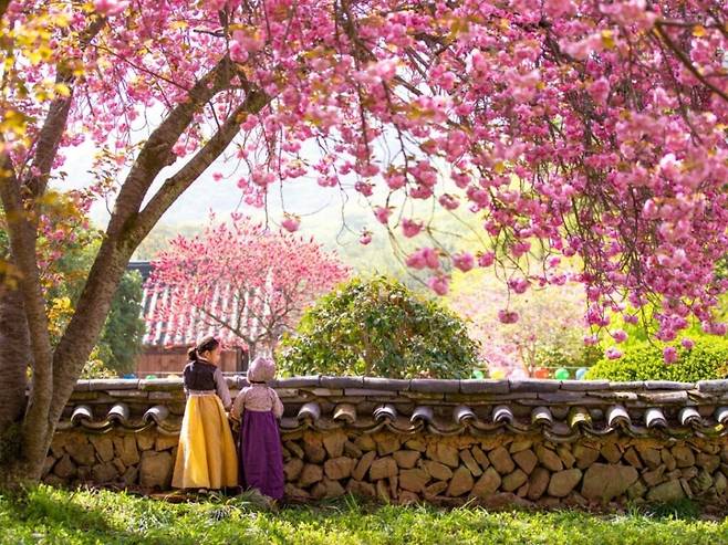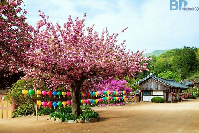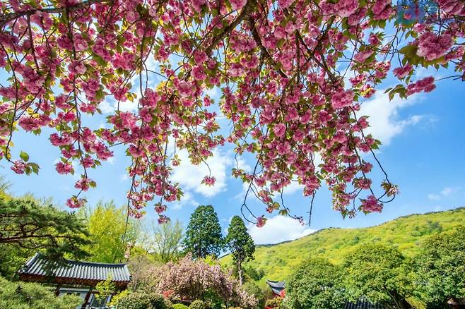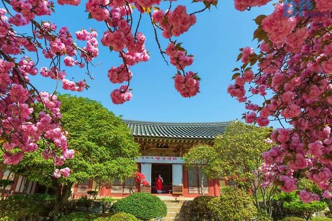 바람결에 흩날리는 꽃잎 사이로 부드러운 햇살이 스며들고, 꽃잎 너머로 고요히 모습을 드러내는 것은 다름 아닌 천년 고찰의 지붕이다.