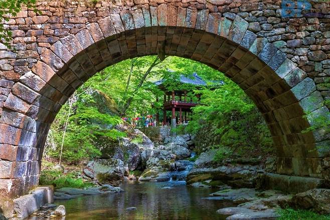 사찰 앞에는 아치형의 ‘승선교’가 있다. 자연 암반을 그대로 받침대로 삼아 만든 이 다리는 보물로 지정되어 있으며, 중앙에 조각된 용머리가 인상적이다.
