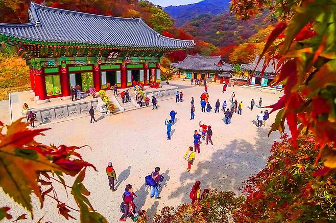 작고 붉은 단풍잎이 사찰 주변을 물들이며, 백학봉과 쌍계루의 풍경과 어우러져 한 폭의 그림 같은 풍경을 자아냅니다.