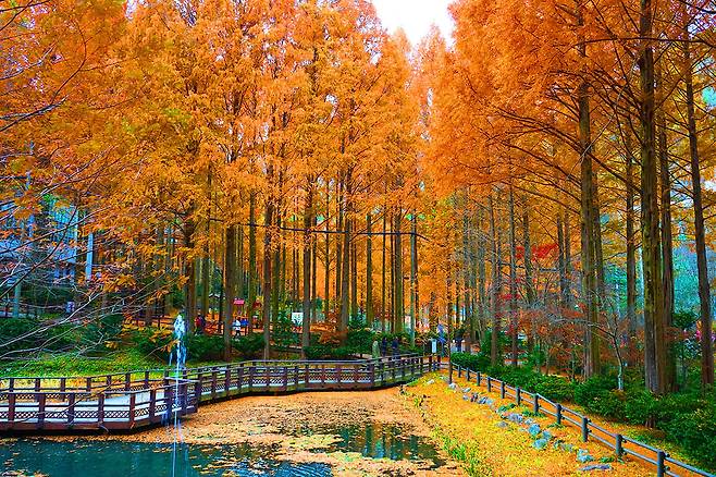 가을이 되면 메타세쿼이아 나무들이 붉게 물들어 이국적인 풍경을 자아내며, 산책로를 따라 걷다 보면 가을의 정취를 온몸으로 느낄 수 있습니다.
