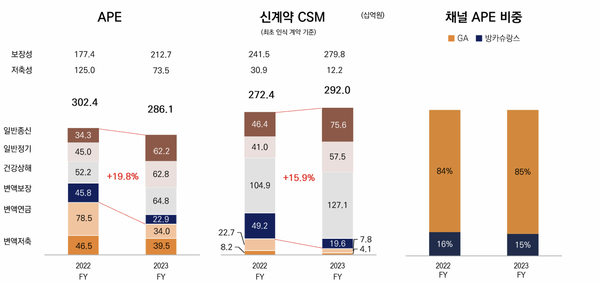 신계약 CSM의 경우 보장성 보험 판매 증가 효과로 전년 대비 7.2% 증가한 2918억원 확보했다. CSM은 2023년 3분기 실손보험 계리적가정 가이드라인 변경으로 1885억원의 감소가 있었음에도 불구, 2023년말 기준 CSM은 2조215억원으로 2조원 넘어섰다. 이 가운데 보장성보험 비중은 76.5%에 이른다.