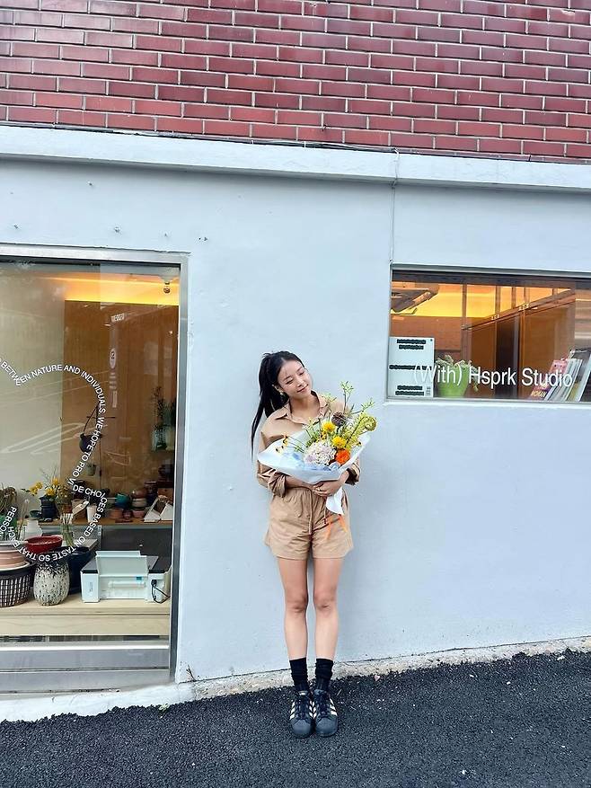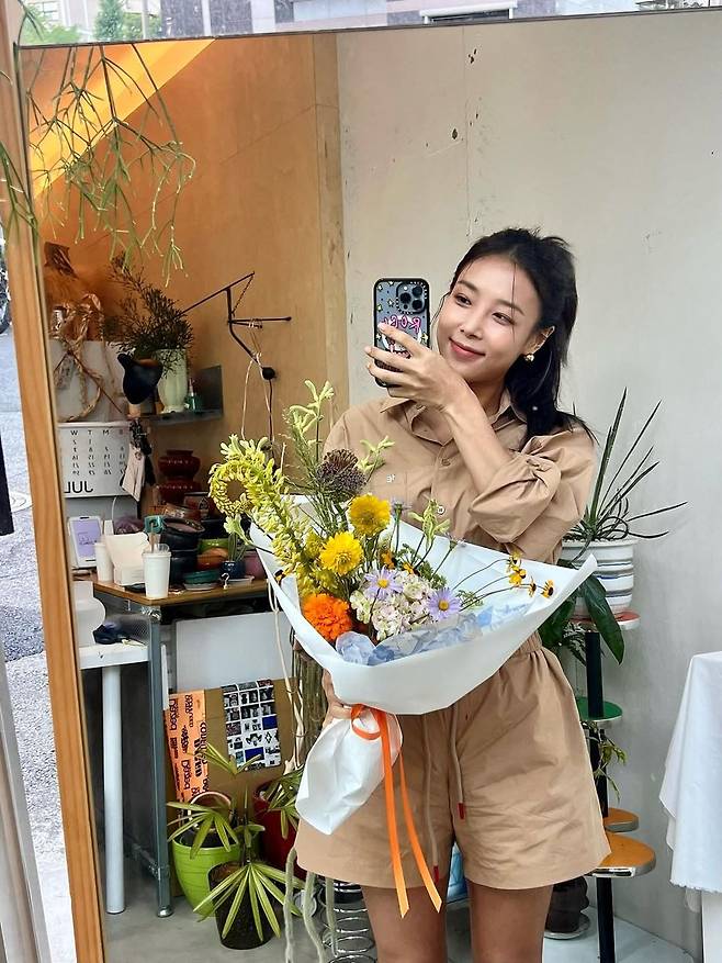 유빈이 인스타그램에 올린 한 장의 셀카가 시선을 사로잡는다. ‘my little flower’라는 멘트와 함께 공개된 사진 속 그는 내추럴한 공간에서 환한 미소와 함께 꽃다발을 들고 서 있다. 따뜻한 조명과 거울에 비친 소박한 배경은 그의 베이지 점프수트 스타일링을 더욱 빛나게 했다.