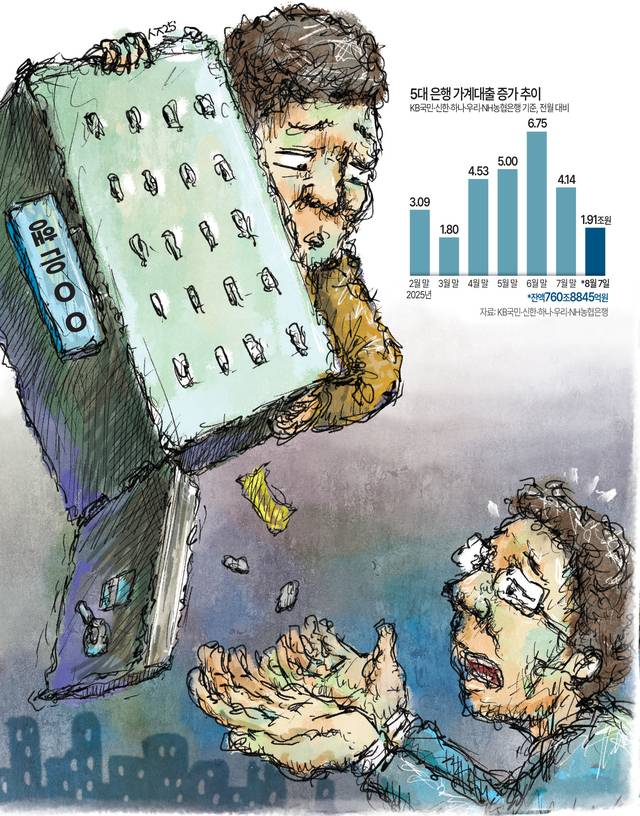 이달 들어 5대은행(KB국민·신한·하나·우리·NH농협)의 가계대출이 2조원 넘게 급증했다. 이대로라면 역대급 대출 증가 폭을 기록할 전망이다. 6·27 부동산 대출 규제 직전 선수요가 발생한 영향이 크다. 가계대출 총량 관리에 비상이 걸린 은행들은 대출 옥죄기에 나서고 있다. 대출모집인을 통한 주택담보대출(주담대)과 전세 대출을 막으면서 벌써부터 10월 대출까지 받기 힘들어질 것이란 관측이 나오고 있다. 결국 실수요자들의 속앓이만 깊어지는 형국이다.