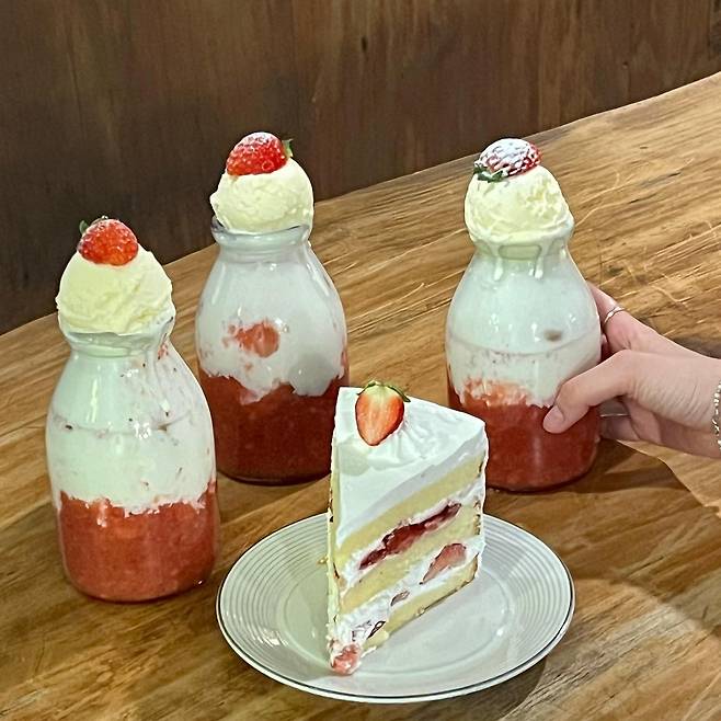 ▲가격: 케이크(1조각) 7,000원, 딸기라떼 7,500원, 밀크티스무디 6,500원