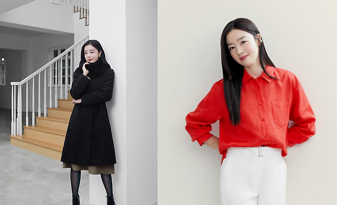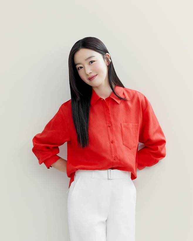 세 번째 사진에서는 강렬한 레드 셔츠와 화이트 팬츠로 산뜻하고 밝은 이미지를 연출하고 있다. 셔츠의 컬러감이 돋보이며, 심플한 디자인의 팬츠와 조화를 이루어 깔끔한 오피스룩 또는 데일리룩으로 손색이 없다. 미니멀하면서도 포인트가 살아있는 스타일링이 특징이다