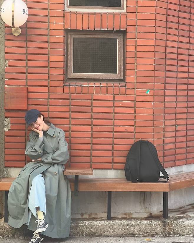 네 번째 사진 속 한선화는 오버사이즈 그린 트렌치코트와 연청바지, 캡모자, 그리고 블랙 컨버스 스니커즈로 편안하면서도 감각적인 스트리트룩을 선보이고 있다. 벤치에 앉아 자연스럽게 포즈를 취한 모습이 일상 속 자유로운 분위기를 강조한다. 실용성과 스타일을 동시에 갖춘 데일리룩이다