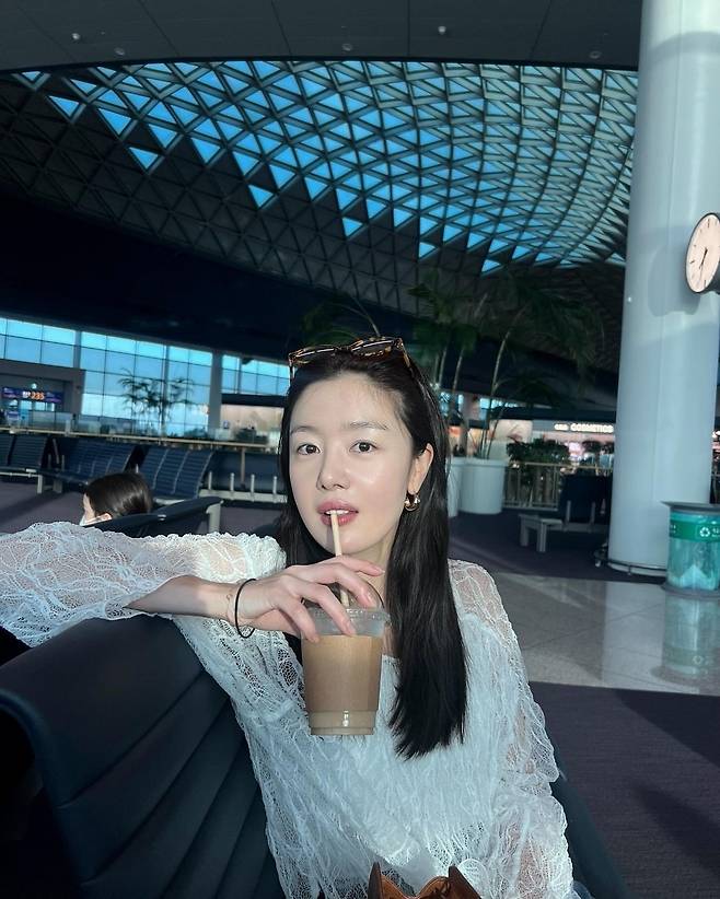 첫 번째 사진에서 한선화는 레이스 소재의 화이트 블라우스와 내추럴한 헤어스타일, 미니멀한 액세서리로 청순하면서도 편안한 공항 패션을 완성했다. 햇살 아래 투명하게 빛나는 피부와 자연스러운 미소가 어우러져, 꾸미지 않은 듯한 내추럴룩의 정수를 보여준다