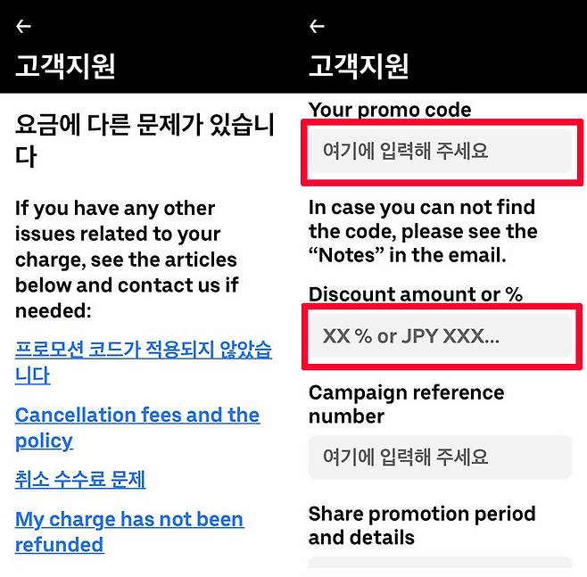 여기에서 ‘차량 서비스 관련 지원’ - ‘요금에 다른 문제가 있습니다.’- '프로모션 코드가 적용되지 않았습니다.’ 를 눌러 줍니다.