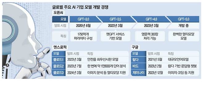 AI를 둘러싼 경쟁이 치열해지면서 개발 속도가 빨라지고 있다. 오픈AI는 2020년 6월 인간 두뇌의 시냅스에 해당하는 파라미터가 1750억개에 달하는 GPT-3.0을 발표했다. 이후 2022년 3월 챗GPT 서비스의 근간이 되는 GPT-3.5를, 2023년 3월 영문 책 300장의 처리 능력을 갖춘 GPT-4.0을 공개했다.