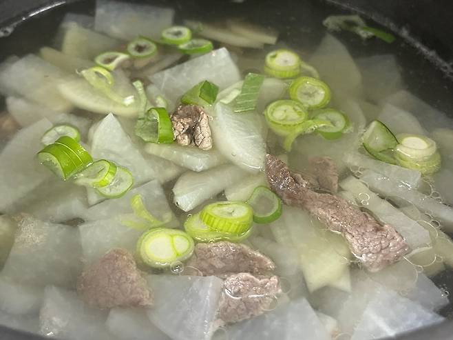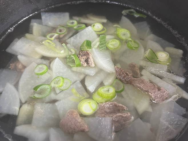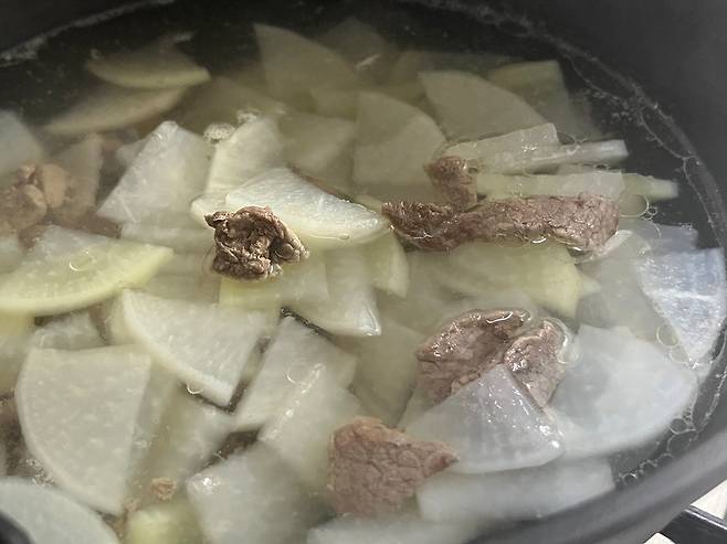 소고기와 무에서 충분히 감칠맛이 우러나오도록 끓여 줍니다. 무가 투명해질 때까지 끓여 주세요.