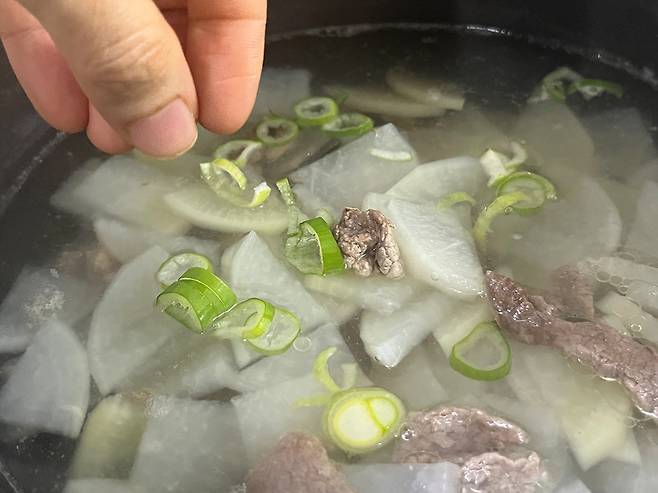 국이 거의 완성될 때쯤 대파 썰어 놓은 것을 넣습니다. 대파는 마지막 단계에 넣어야 대파 특유의 은은한 단맛과 향긋한 향이 그대로 살아납니다.