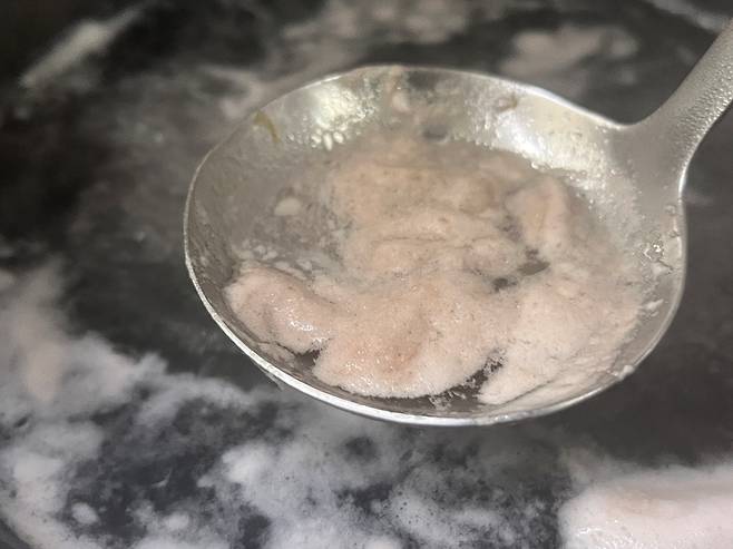 소고기 육수를 내다보면 이렇게 거품과 불순물들이 섞여 떠오르게 됩니다. 이것을 그냥 두면 국물이 탁해지고, 감칠맛도 떨어집니다. 국자나 거름망으로 꼼꼼히 걷어내야 맑고 깨끗한 육수가 완성됩니다.