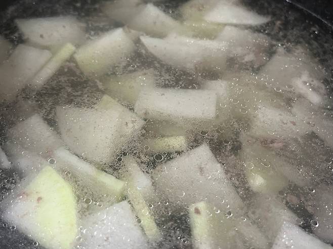 소고기 국물이 우러나면 무를 넣고 함께 끓여 주세요. 무는 단단하기 때문에 익는 데 시간이 약간 소요됩니다. 강불 대신 중 약불로 천천히 육수를 우려내는 것이 중요합니다.