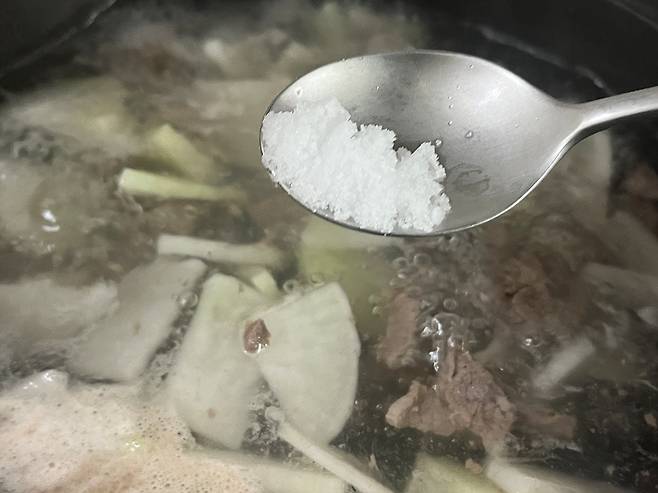 소고기 뭇국 양념은 다른 것 필요 없이 꽃소금 또는 왕소금 하나만 있으면 됩니다. 약 1/3 스푼 정도 넣어서 간을 합니다. 소고기와 무에서 감칠맛이 충분히 우러나오기 때문에 다른 양념은 필요 없습니다.