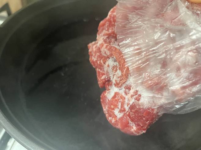 소고기 뭇국의 메인 재료는 소고기와 무인데요. 두 가지 재료만 신선하고 맛있다면 절대 실패할 수가 없습니다. 질 좋은 소고기 양지 150g을 끓는 물에 넣어 국물을 우려냅니다.