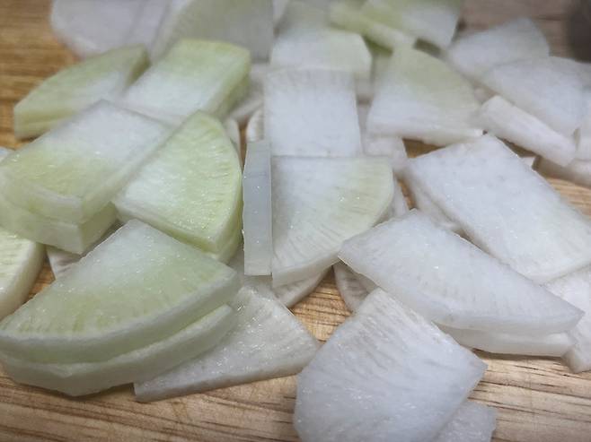 무는 너무 두껍지도, 얇지도 않게, 약 0.4~0.5cm 정도로 썰어서 준비합니다. 무 고를 때는 묵직하고 단단하며, 껍질이 매끈하고 색이 선명한 것을 고르세요.