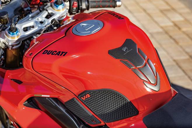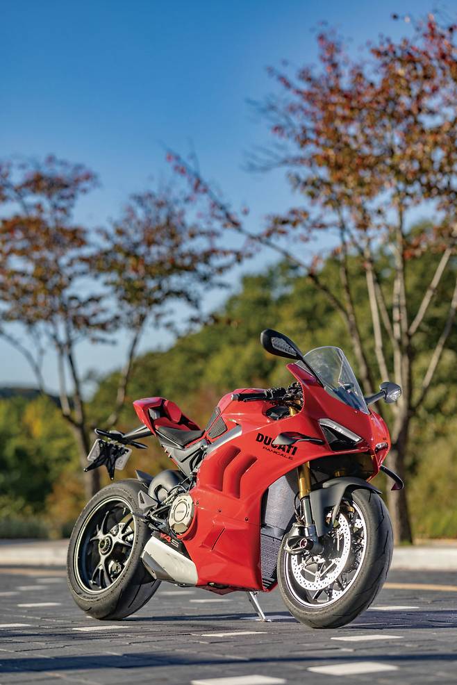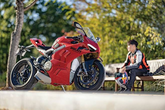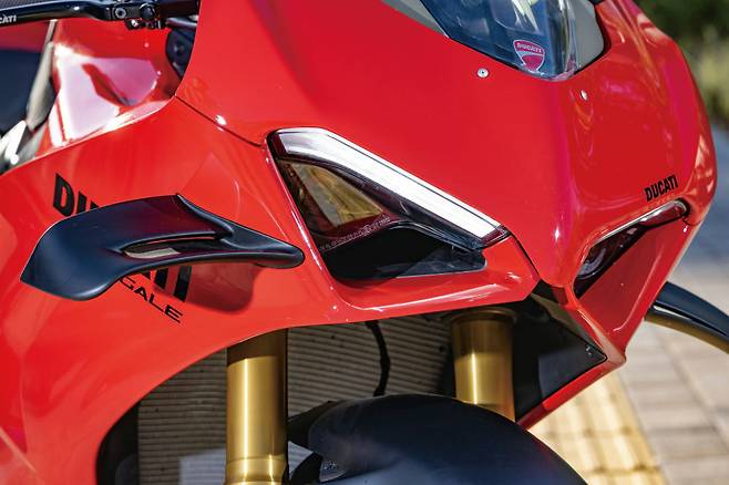 두카티 파니갈레 V4의 실루엣은 처음 출시했을 당시 모델부터 크게 달라지지 않았을 정도로 완성도가 높다. 특히 초기 모델이 아닌 전 세대 모델과 비교하면 윙렛 디자인의 변화, 페어링의 레터링 컬러, 사이드 슬릿추가 등의 차이가 전부다. 하지만 그 변화로 인해 바이크 자체에서 묻어나오는 고급스러움과 강렬함은 한층 더 높아졌다. 지금까지 차체 페어링에 화이트를 사용했던 부분을 모두 블랙으로 바꾸며 레드의 존재감이 더욱 또렷해졌다.