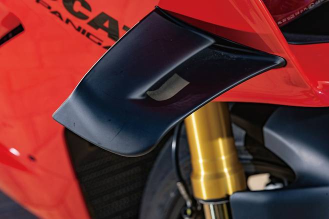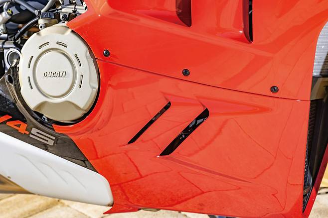 변경된 윙렛은 이전 모델보다 간결한 디자인이며 성능은 이전과 동일하게 300km/h의 속도에서 37kg의 다운포스를 만든다. 윙렛이 양산형 모델에 처음 적용되기 시작했을 당시, 너도나도 더 크고 과감한 디자인을 선보였는데 새로운 V4S는 이젠 유치하다는 듯 시크한 느낌이다. 이어서 2세대 모델부터 적용되었던 사이드 페어링의 슬릿이 엔진 하단부에도 추가되어 공기의 흐름을 극대화하며 엔진과 퀵시프터 센서 냉각 효율을 높였다. 과거 슬릿이 없었던 파니갈레 V4S의 첫 번째 모델과 비교하면 훨씬 공격적인 분위기가 느껴지는 이유이기도 하다.