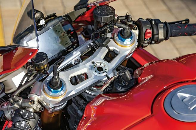 늘 그렇듯이 파니갈레에 앉아 핸들을 잡는 순간 양산형 바이크보다 레이스 머신의 냄새가 짙다. 전방으로 꽂히는 쐐기 형태의 디자인처럼 공격적인 자세가 취해진다. 시트고는 850mm로 꽤 높은 편이고 핸들 바는 시트보다 살짝 낮은 느낌이기 때문이다. 수치상으로 연료 탱크가 1ℓ 커져 17ℓ가 되었는데 여전히 납작하고 인체공학적으로 디자인된 만큼 차이를 느낄 순 없다. 바이크가 움직이기 시작하면 콤팩트한 차체에 꽉 맞게 조여진 포지션이 취해진다. 신장 178cm의 라이더 입장에서 바이크의 무게 중심 가운데 위치하여 약간의 움직임만으로 빠르게 조작할 수 있다는 확신이 든다.