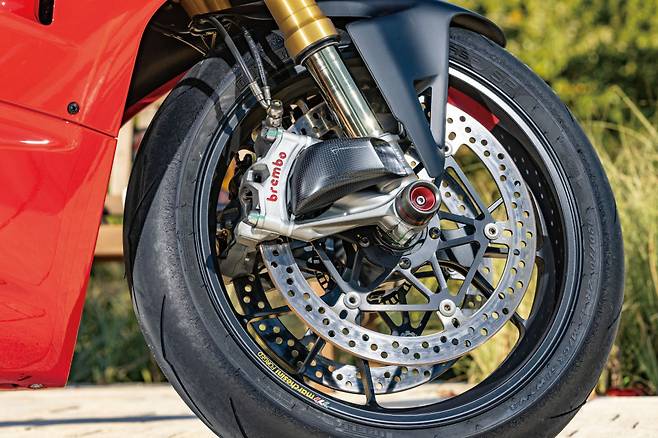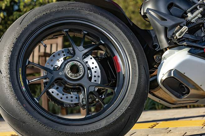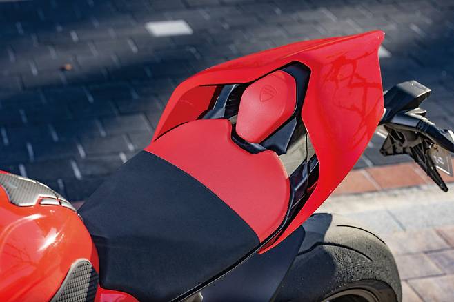 두카티는 ‘완벽한 이탈리안 레드’를 선보이는 브랜드다. 시트는 전후를 블랙과 레드로 나눈 투톤 컬러로 적용해 라이더 시트 공간이 더 콤팩트하고 가벼운 느낌을 준다. 또한, 리어의 레드 컬러는 간결하고 날렵한 리어 페어링 디자인과 자연스레 녹아든다. 게다가 전방 블랙 부분은 알칸타라 느낌의 소재를 사용하고 레드 컬러 부분은 돌기가 있는 일반적인 시트피로 덮어 다양한 주행 포지션을 취했을 때 더 효과적으로 자세가 홀딩되도록 고려했다. 이어서 V4S에 적용된 삼지창 형태의 3스포크 마르케지니 단조 휠에도 레드 포인트를 넣은 디테일이 돋보인다.