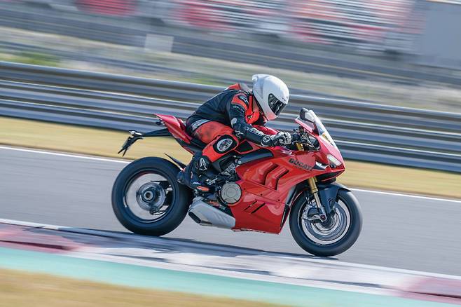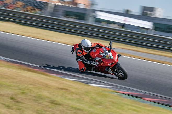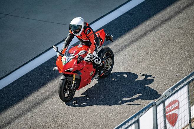 개인적으로 파니갈레 V4 S를 도로에서만 시승하고 이렇다 저렇다를 말할 수 없다고 생각했다. 그래서 영암 KIC로 향했다. 순정 상태 그대로 아무것도 더하지도 빼지도 않고 오직 타이어 공기압만 조절하고 서킷에 들어섰다. 참, 주행 모드는 레이스 A, 레이스B, 스포츠, 스트리트 총 4가지가 있는데 가장 공격적인 레이스 A 모드로 설정했다. 본격적인 자세를 취하고 스로틀을 비틀며 주행하니 이전에 도로 시승에서 느꼈던 피곤함이 말끔하게 사라졌다. 오직 코너를 진입하기 전에 엉덩이를 빼고 어디서 제동할 것인지 그리고 어디서 스로틀을 전개하기 시작할 것인지 고민할 뿐이었다.