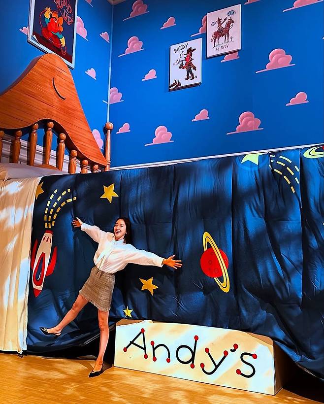 애니메이션 속 장면이 그대로 펼쳐진 듯한 전시 공간, ‘문도픽사’에서 전혜빈이 포착됐다. 우디의 방을 그대로 재현한 듯한 배경 속에서 전혜빈은 특유의 환한 미소와 함께 클래식하면서도 러블리한 셔츠 코디로 눈길을 사로잡았다.