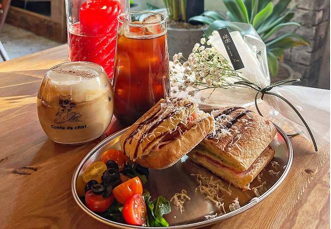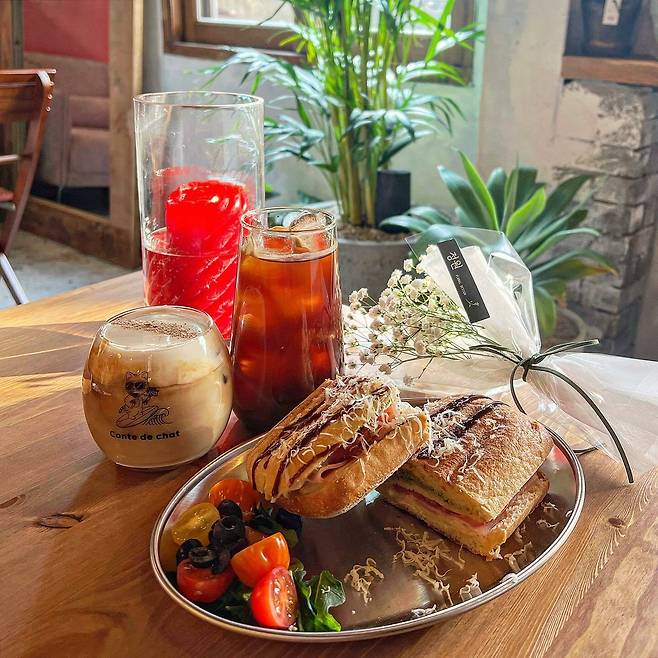 꽃과 커피를 즐길 수 있는 플라워 카페 전포동 '꽁띠드샤'. 입구부터 이국적인 느낌이 드는 이 카페는 내부도 구석구석 신경 쓴 느낌이 가득하다. 꽃집과 함께 운영되기 때문에 곳곳에 예쁜 식물들도 감상할 수 있다. 꽃과 커피뿐 아니라 브런치도 함께 즐길 수 있는데 오늘의 수프와 오이토스트, 베이컨 파니니, 참치 파니니, 폴드포크 파니니를 주문할 수 있어 든든한 한 끼를 즐기기에도 충분하다. 카페 안에 애교 많은 고양이가 함께 있기 때문에 알레르기가 있는 사람은 주의할 것.