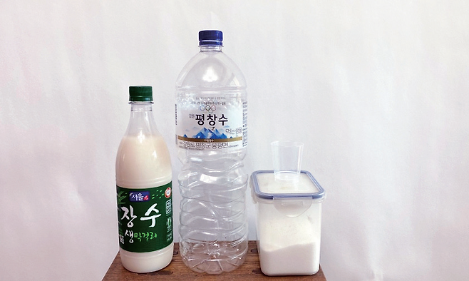 1. 빈 생수병에 설탕을 소주잔으로 반 잔 넣습니다. 설탕은 막걸리에 들어 있는 미생물의 먹이가 되어요.