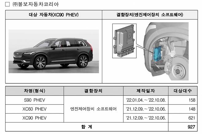 리콜 대상은 2022년 1월 4일에서 동년 10월 8일 생산된 S90 PHEV, 2021년 12월 9일에서 2022년 10월 6일 제작된 XC60 PHEV, 2021년 12월 9일에서 2022년 10월 6일 생산된 XC90 PHEV 등 총 927대가 포함됐다. XC60 PHEV와 XC90 PHEV의 경우 앞선 무상수리 모델과 제작 일자가 일주일 안팎이다.