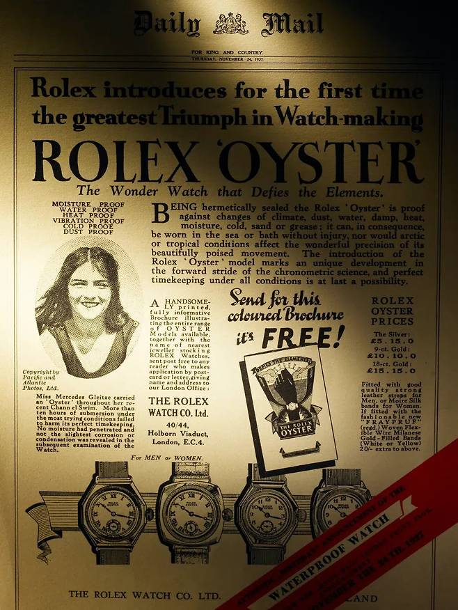 롤렉스는 1926년 최초의 방수 손목시계 중 하나인 오이스터를 출시했습니다. 그리고 이듬해 젊은 속기사 메르세데스 글리츠가 오이스터를 착용하고 도버 해협 횡단에 도전했습니다. 시계는 바닷물 속에서도 완벽히 작동했고 오이스터의 뛰어난 내구성과 방수 성능을 대중 앞에 각인시켰습니다. 롤렉스는 영국 주요 신문에 ‘자연의 한계를 뛰어넘는 놀라운 시계(The Wonder Watch that Defies the Elements)’라는 광고를 실으며 브랜드 인지도를 폭발적으로 높였습니다.