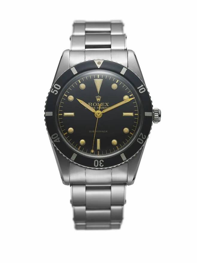 시계는 지름 37mm에 검은색 다이얼과 베젤, 롤렉스만의 독특한 인덱스를 갖췄습니다. 지금과 크게 다르지 않은 모습입니다. 서브마리너의 첫 모델은 100m 방수를 보장했고, 이듬해부터 200m로 높아졌습니다.