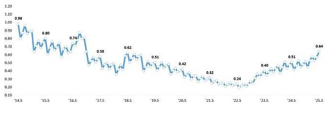 25일 금융감독원에 따르면 지난 5월 말 기준 국내은행의 원화대출 연체율(1개월 이상 원리금 연체 기준)은 0.64%로 전월 말(0.57%) 대비 0.07%p 상승했다.