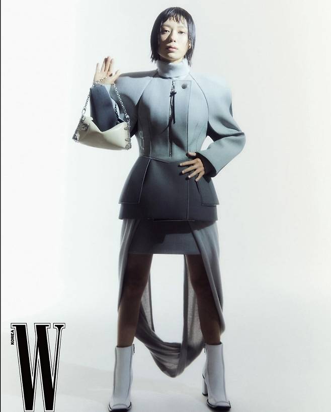 김예지는 블루 목폴라 스웨터에 아이보리 퀼팅 캉캉 롱스커트를 매치해 유니크하고 세련된 분위기를 연출했습니다.