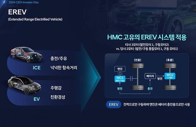 이번 투자를 통해 현대차는 원천 기술 개발 및 핵심 미래 역량을 확보하기 위해 사용되는데, 그 기술 목록을 살펴보면 ‘EREV’라는 용어가 있다. 요즘 몇몇 자동차 업체에서 EREV 기술력을 개발해 차량에 적용하는 모습을 보이고 있는데, 이 EREV란 무엇일까?