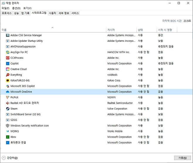 백그라운드 앱을 줄이려면 노트북을 부팅할 때 자동으로 시작되는 '시작 프로그램'에서 제외하는 것도 좋은 방법이다. 대부분의 백그라운드 애플리케이션은 Windows 부팅 시 자동 실행되는데, 작업관리자의 시작 프로그램 탭에서 불필요한 항목을 우클릭해 ‘사용 안 함’으로 전환해 꺼주자. 한 번만 설정해두면 매번 일일이 종료할 필요 없이 배터리 절약 효과를 지속적으로 얻을 수 있다.