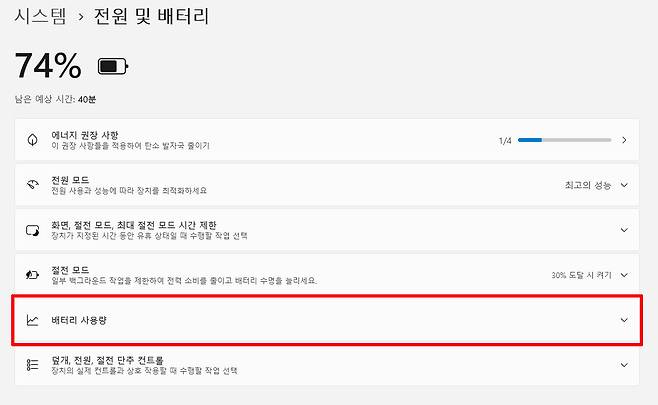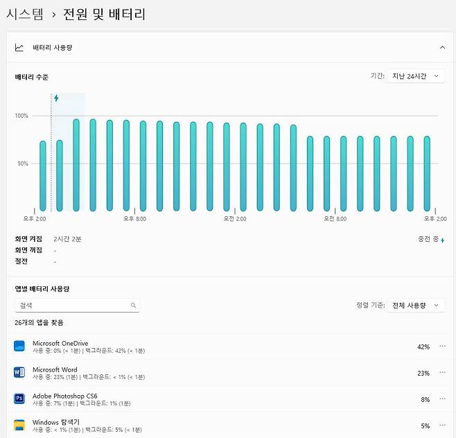 Windows 11에서는 ‘설정 → 시스템 → 전원 및 배터리’ 메뉴의 ‘배터리 사용량’을 클릭하면, 시간대별 배터리 충전 상태는 물론 지난 24시간 또는 7일 동안 배터리로만 작동한 상황에서의 앱별 소비 전력을 확인할 수 있다. 또한 각 앱이 총 소비 전력 중 몇 퍼센트를 차지했는지도 함께 표시해 준다. 오른쪽 상단의 정렬 옵션을 활용하면 사용 중인 애플리케이션과 백그라운드 앱을 구분해 나열할 수 있어, 배터리 소모가 많은 앱을 파악하고 관리하기가 한층 수월하다.