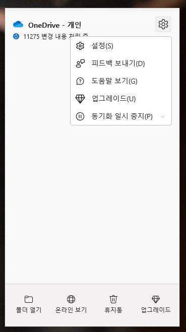 먼저 OneDrive, Google Drive, Dropbox 같은 클라우드 동기화 앱을 들 수 있다. 이들 앱은 서버와 실시간으로 동기화를 시도하기 때문에 CPU와 네트워크 사용률이 높아지고, 자연스럽게 전력 소비도 증가한다. 물론 파일 백업이 꼭 필요한 사용자라면 항상 켜두는 것이 맞지만, 가급적 전원이 연결된 상태에서 동기화를 진행하는 것이 좋다. 특히 노트북을 들고 이동 중이거나 배터리가 부족한 상황이라면 잠시 동기화를 꺼두는 편이 훨씬 효율적이다. 또한 OneDrive 계정 하나로 PC와 노트북 여러 대를 운용할 경우, 오랜만에 켠 기기에서 수천 개의 파일이 한꺼번에 동기화되는 상황이 발생할 수 있다. 따라서 정기적으로 백업을 진행해두는 것이 정신 건강에도 이롭다. 11275개.. 실화인가..