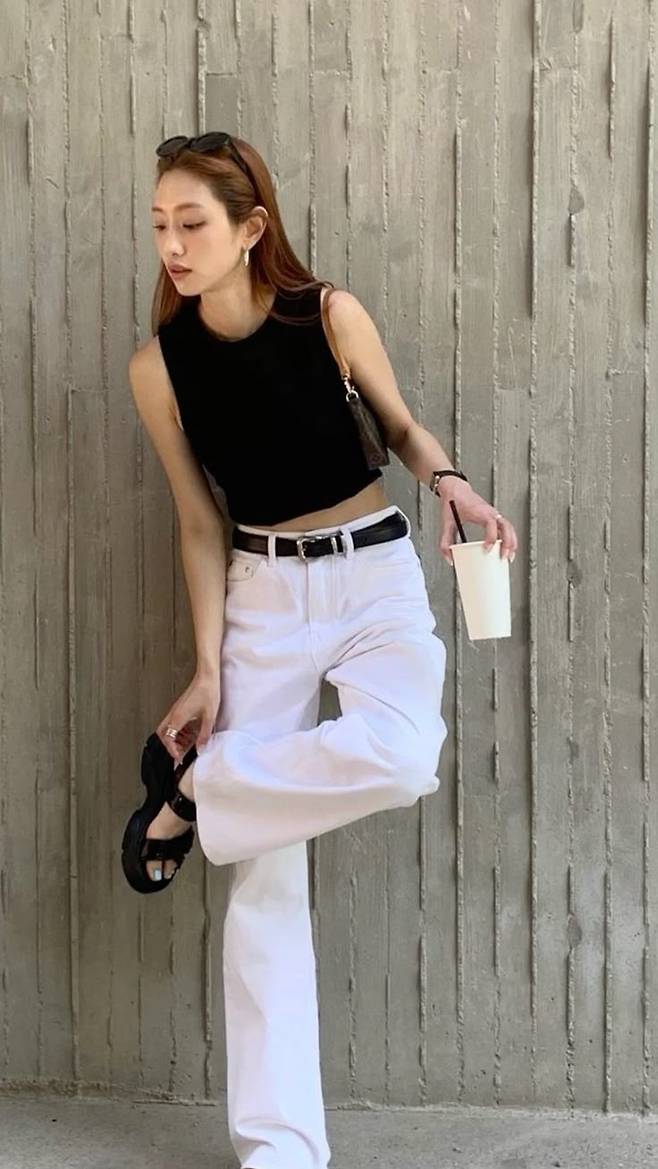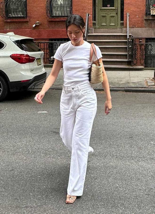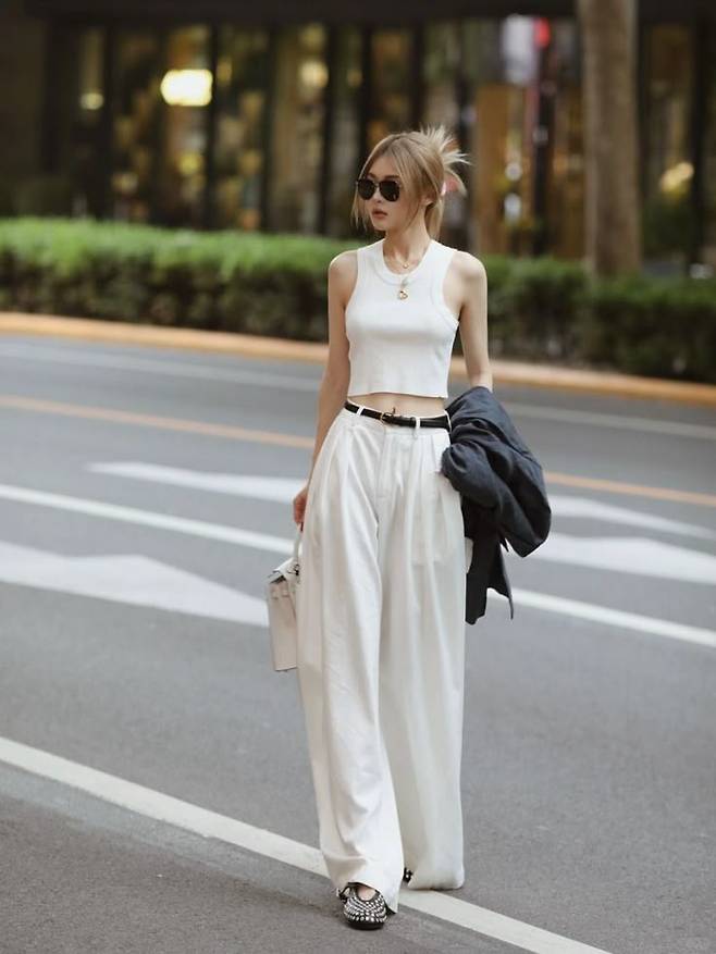 무채색 속에서 빛나는 화이트 팬츠, 이번 여름 꼭 도전해보세요.