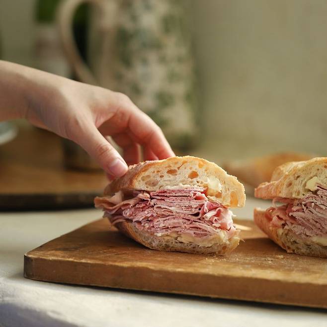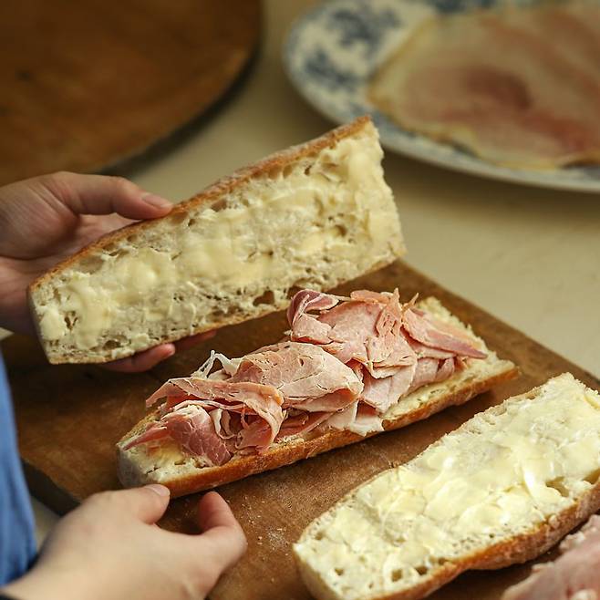 잠봉과 버터, 바게트 세 가지가 전부인 간단한 샌드위치이지만 고급스러우면서 다양한 맛을 즐길 수 있습니다. 바삭한 바게트에 짭짤하면서도 감칠맛이 나는데요. 잠봉, 버터의 고소함이 조화를 이룹니다.