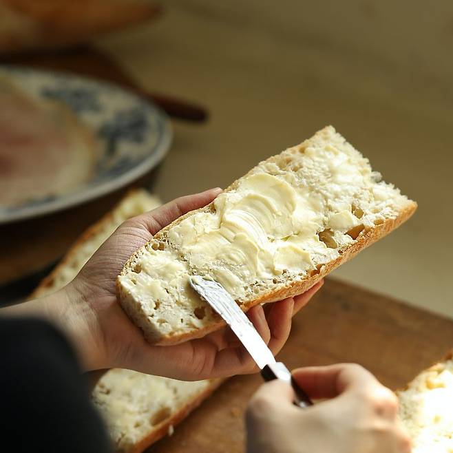 2. 빵 양쪽 면에 버터를 바른다.