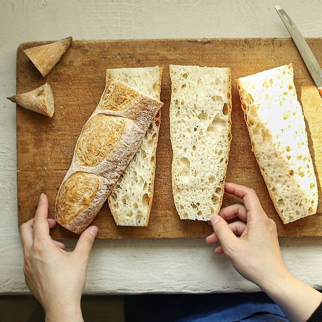 1. 바게트는 양쪽 끝을 살짝 잘라 이등분한 뒤 단면을 자른다.