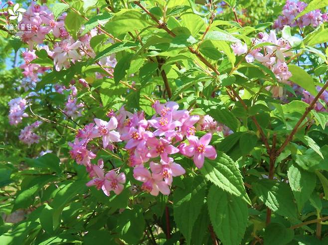꽃말발도리 ‘몽 로즈’는 일본과 중국이 자생지로, 초여름 연한 장밋빛 분홍색 별 모양 꽃을 모아 피우는 것이 특징이다. 소형 관목이지만 개화기에는 색감과 형태가 확연히 살아나며, 시각적으로 강한 인상을 남긴다.