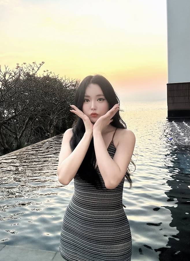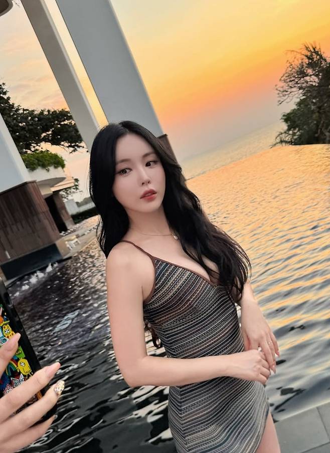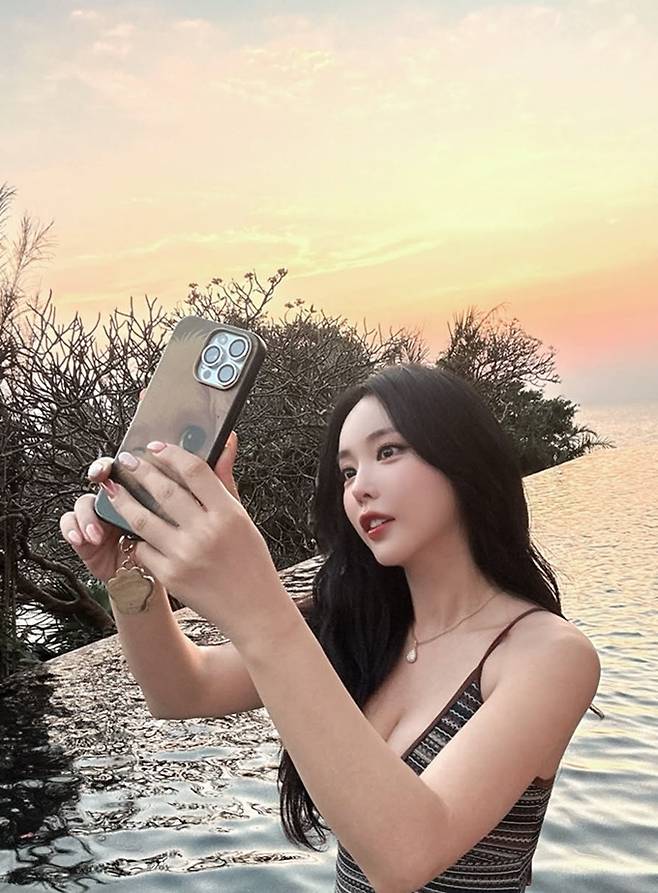 수영장에서 사진만찍기, 물에 들어가진 않음ㅋ. 실물과 다소 차이가 있을수 있습니다 ㅋㅋㅋ”라는 글과 함께 수영장을 배경으로 한 수영복 스타일링 사진을 게재했다.