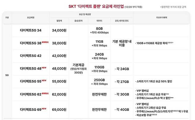 월 3만4000원인 5G 다이렉트34는 기본 데이터 제공량이 8GB로 소진시 속도제한(QoS) 1Mbps인데 15GB 제공에 3Mbps로 늘렸다. 월 3만7500원인 5G다이렉트37.5는 12GB+1Mbps를 20GB+3Mbps로, 월 4만4000원인 5G다이렉트44는 31GB+1Mbps를 40GB+3Mbps로 확대 제공한다. 추가 제공 기간은 내년 1월 31일까지다.