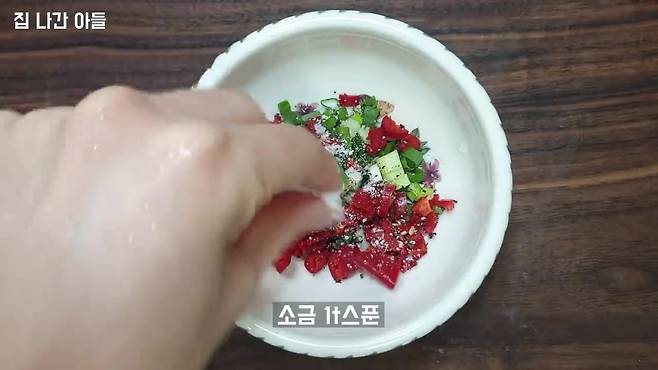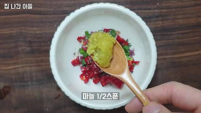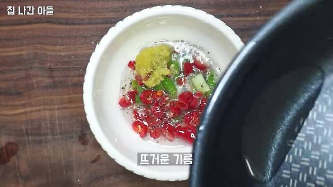 소금 한 꼬집, 후추 약간, 다진 마늘 0.5스푼을 넣습니다. 뜨거운 기름을 위에 부어 풍미를 더해주세요 느끼할 거라고 생각할 수 있겠지만 향이 끝내줍니다
