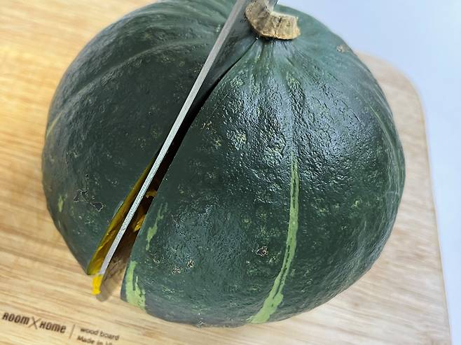 단호박은 칼로 반을 먼저 잘라줍니다.