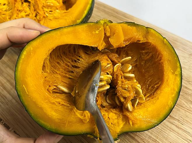 전자레인지에서 꺼낸 단호박은 한 김 식혀줍니다. 4~5분간 돌리면 겉은 물론 안쪽도 매우 뜨겁기 때문에 손으로 만지면 위험할 수 있습니다.