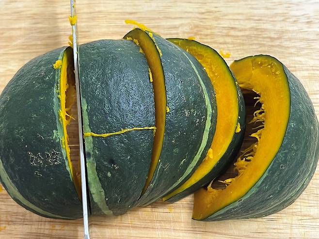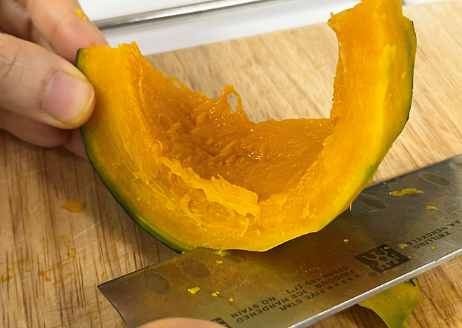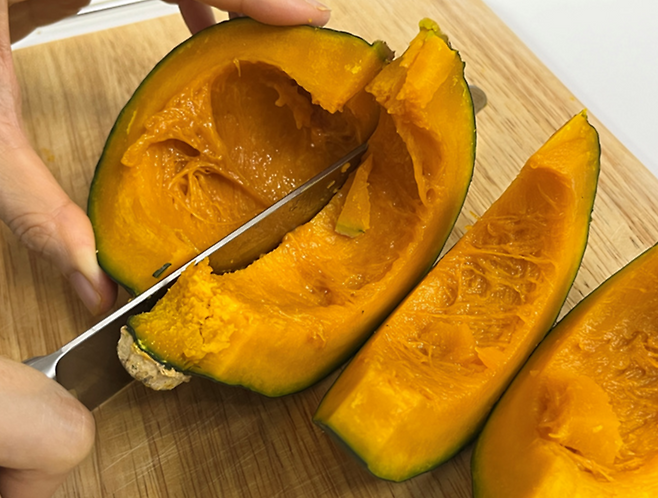 단호박을 반드시 충분히 식힌 후 잘라주세요. 전자레인지에 이미 돌렸기 때문에 껍질과 속살이 부드러워져 쉽게 잘립니다.
